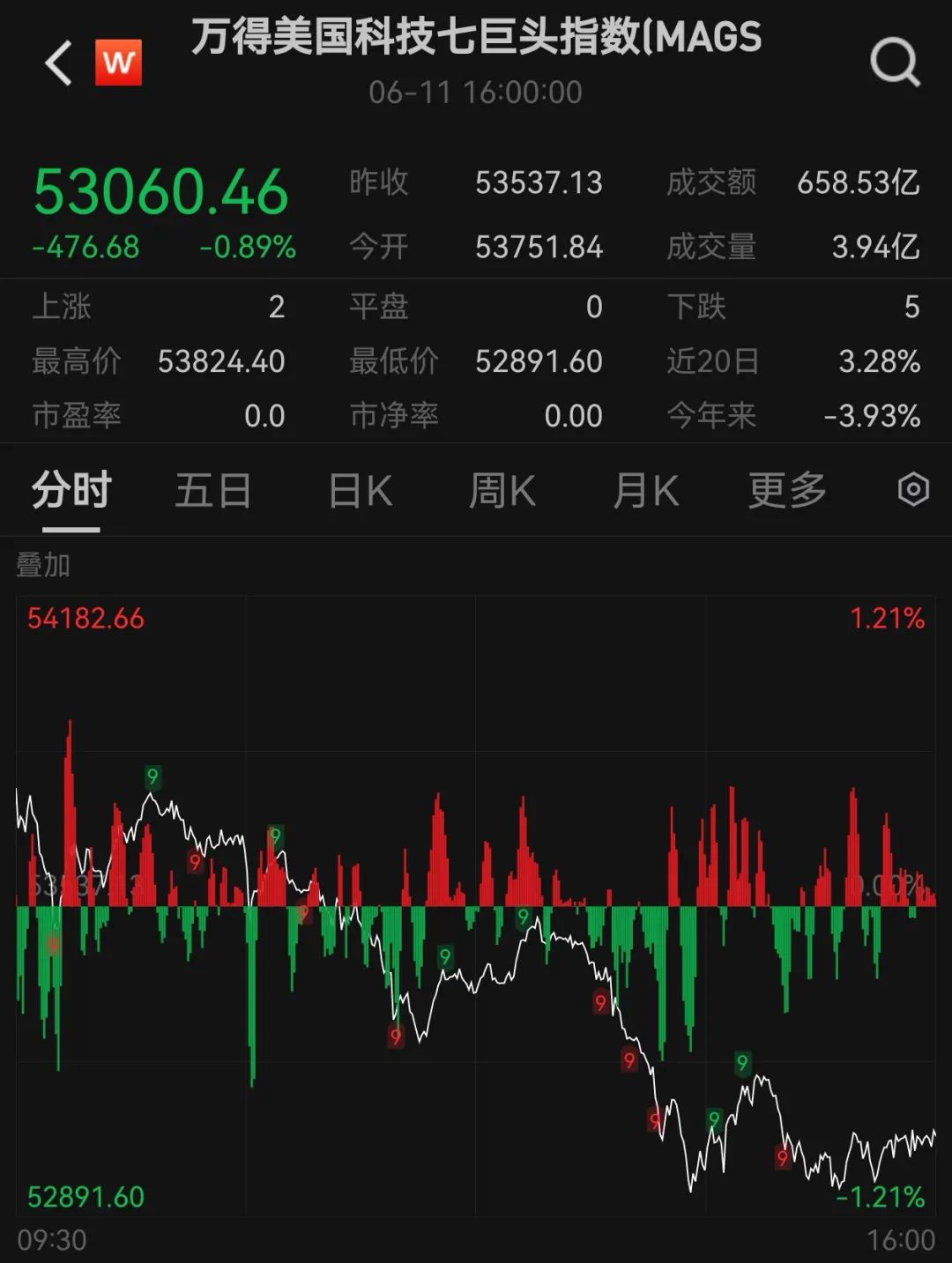 美股大型科技股多数下跌,万得美国科技七巨头指数高开低走,截至收盘跌近1%;成分股中,微软、特斯拉上涨,谷歌母公司Alphabet、英伟达、Meta、苹果、亚马逊均收跌。