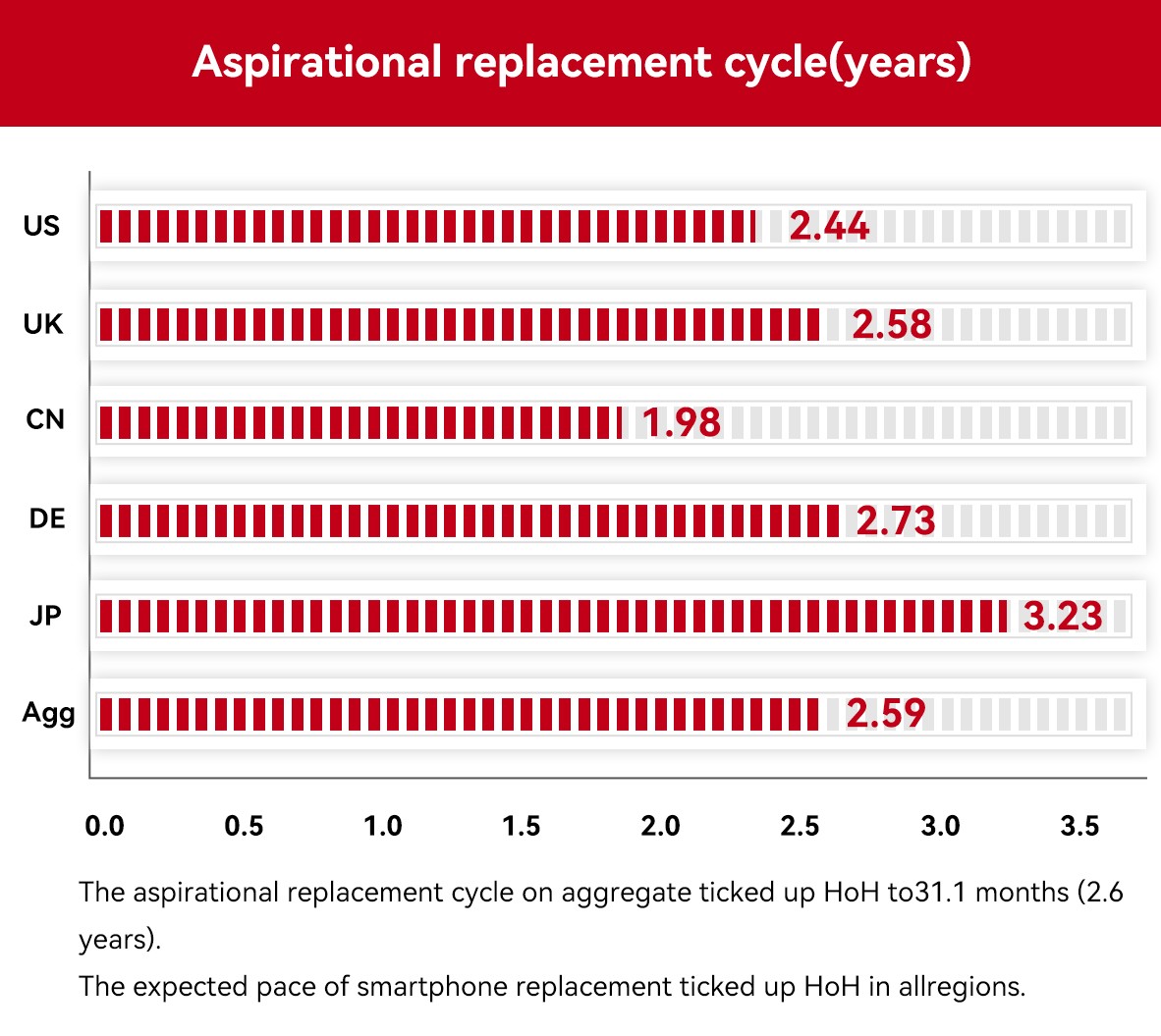 与此同时,全球用户对智能手机的购买意愿持续走低。数据显示,用户平均计划持有手机31.1个月才更换,相较于高昂的换机成本,用户们更希望手中的设备能够长期稳定运行银泰融通,而品牌能否提供可靠售后,也成为他们下次购机时的重要考量。
